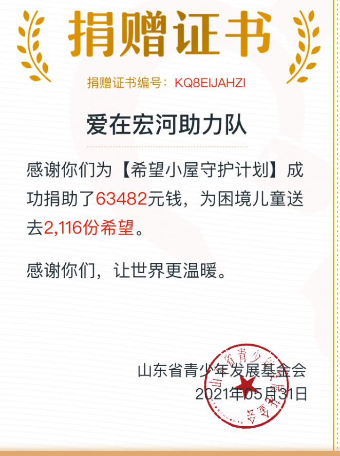 鄉(xiāng)村振興的路上, 孩子是我們最大的牽掛。 追逐夢想的途中, 愛是給孩子最好的賦能。 宏心向黨 聚力成河 讓希望、讓愛在宏河! 為一個孩子筑一方希望空間! “希望小屋”是共青團山東省委、山東青年聯(lián)合會、山東省青少年發(fā)展基金會共同發(fā)起的困境兒童關愛項目,自2020年6月啟動發(fā)起募捐倡議以來,受到全社會廣泛關注和支持。2020年集團共籌集到愛心捐款138611元,兩年來捐款所得款累計20萬余元,統(tǒng)一定向給鄒城市希望小屋項目建設。集團廣大干部職工齊心協(xié)力從“希望小屋”出發(fā),以“為群眾辦實事”的初心責任,匯聚愛心傳遞對困境兒童的關愛,幫助更多有需要的孩子改善現(xiàn)狀走出困境,健康成長為祖國的棟梁之才。 近年來,宏河集團秉承“幸福員工、鑄就未來、服務社會、溫暖人間”的企業(yè)使命,積極關注并致力于社會公益活動,通過黨、政、工、團群體組織積極摸排協(xié)調并解決貧困職工家庭問題,特別是貧困殘疾人員家庭無獨立居住和學習環(huán)境孩子的教育問題。在以往金秋助學、愛心送考、精準扶貧、慈心一日捐、抗疫捐款等工作及公益活動中,主動承擔社會責任,持續(xù)關心關注孩子們的生活和教育問題,希望通過此次為“希望小屋”的捐款,幫助更多孩子們健康成長。 自“希望小屋”兒童關愛項目實施以來 一座座“希望小屋”陸續(xù)在齊魯大地 生根萌芽、開花結果 “希望小屋” 承載著愛與希望 呵護每一個孩子的心靈 守護每一個家庭的未來 涓涓細流匯聚大愛江海 點點星光閃耀希望銀河 每一份愛心都將化為強大的力量 我們將帶著大家共同的愛繼續(xù)前進 給需要幫助的孩子生活帶來改變 用“小小的善舉” 助力孩子們“大大的夢想”! |