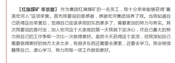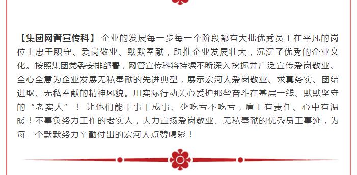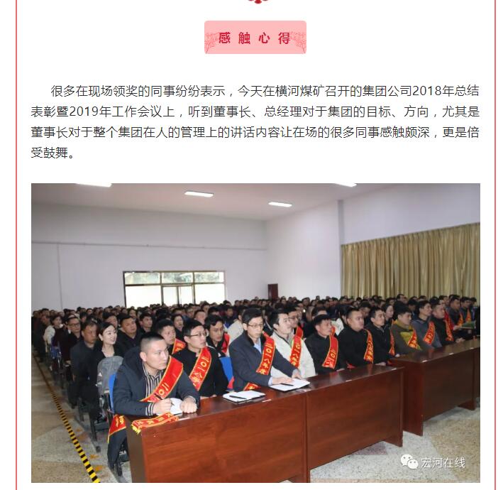 “集團這次對2018年工作中涌現(xiàn)出來的勞動模范、安全標(biāo)兵和愛崗敬業(yè)最美宏河人等先進單位和先進個人,進行了隆重表彰。目的就是通過樹立一批扎根基層一線、踏實苦干實干的先進典型,旗幟鮮明地告訴大家:集團黨政始終關(guān)注在煤礦井上下愛崗敬業(yè)的職工,集團黨政始終關(guān)注在公司車間班組基層一線愛崗敬業(yè)的職工,集團黨政始終關(guān)注在不同崗位上辛勤工作、無私付出、愛崗敬業(yè)的職工?!?集團黨委書記、董事長張文,在大會講話中說。